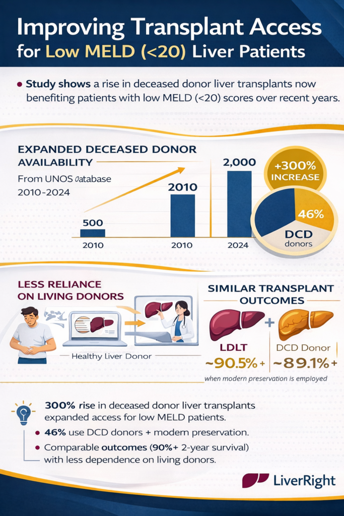 This study examines whether living donor liver transplantation (LDLT) is still necessary for patients with low MELD scores (<20) in the U.S., given increasing availability of deceased donor liver transplants (DDLT)—especially from donation after circulatory death (DCD) donors.