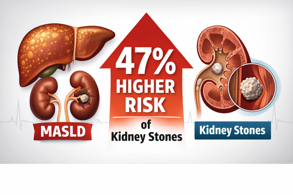 - MASLD associated with ~1.35× increased risk of kidney stones.